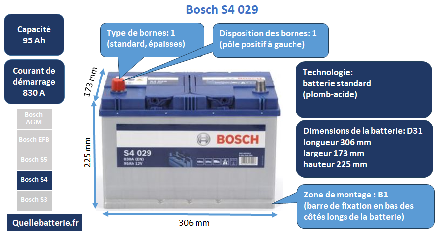 Le modèle Bosch S40 29 est une batterie d'une capacité de 95 Ah et d'un courant de démarrage de 830 A, ce qui en fait un excellent choix pour les véhicules nécessitant une forte puissance de démarrage. Ses dimensions sont de 306 mm de longueur, 173 mm de largeur et 225 mm de hauteur, ce qui le rapproche du format standard D31. Il est donc adapté à de nombreux modèles de voitures à forte demande énergétique, qu'ils soient à essence ou diesel. Cependant, il est important de noter qu'il ne s'agit pas d'une batterie AGM ou EFB, ce qui signifie qu'elle ne convient pas aux véhicules équipés du système Start-Stop.