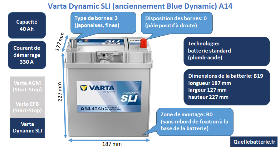 La série Varta Blue Dynamic est l’une des gammes les plus connues du fabricant allemand Varta. Elle se distingue par un excellent équilibre entre performance, fiabilité et accessibilité, ce qui en fait un choix idéal pour les conducteurs recherchant un produit durable à un prix raisonnable. Les batteries de cette série sont conçues pour offrir un courant de démarrage élevé, une réserve d’énergie stable et une longue durée de vie. Elles conviennent particulièrement aux voitures particulières de petite et moyenne taille qui n’utilisent pas de système start-stop. Contrairement aux batteries EFB ou AGM, les accumulateurs traditionnels comme ceux de la gamme Blue Dynamic sont destinés à des véhicules classiques sans exigences spécifiques liées aux technologies modernes d’économie de carburant. Leur popularité en Europe et en Asie s’explique par la combinaison d’une technologie éprouvée, de normes de sécurité élevées et d’une compatibilité avec un large éventail de modèles automobiles. Le Varta Blue Dynamic A14 est un exemple typique de cette philosophie. Il s’agit d’une batterie plomb-acide de 12 volts, dotée d’une capacité de 40 Ah et d’un courant de démarrage à froid de 330 A. Ses dimensions de 187 x 127 x 227 mm la placent dans la catégorie des batteries de type B19, un format très répandu pour les véhicules japonais et coréens compacts. On remarque immédiatement sa hauteur de 227 mm, plus importante que celle des formats européens classiques (généralement 175 ou 190 mm), ce qui confirme son appartenance aux standards asiatiques. Ce type de gabarit est souvent retrouvé sur des citadines et des petites berlines asiatiques, comme certaines Toyota, Honda ou Nissan, mais aussi sur des modèles européens utilisant des blocs moteurs compacts importés. Un élément important à souligner est le type de bornes. Le Varta A14 est équipé de cosses fines de type 3, souvent appelées « bornes japonaises ». Elles sont plus étroites que les bornes européennes standard, ce qui permet un gain de place, mais oblige à s’assurer que les câbles de la voiture sont compatibles ou qu’un adaptateur est disponible. De plus, ce modèle utilise un système de fixation B0. Cela signifie qu’il ne possède pas de rebord inférieur pour être fixé par une bride comme c’est le cas avec les batteries B13 ou B1. Cette caractéristique demande une attention particulière au montage, car elle peut nécessiter des systèmes de maintien alternatifs. Les conducteurs qui remplacent une batterie d’origine japonaise par un modèle européen doivent garder à l’esprit cette différence. À titre de comparaison, les fixations B3/B4, utilisées par certaines batteries Yuasa, restent compatibles avec le standard B13, ce qui les rend plus flexibles. En revanche, le Varta A14 avec montage B0 s’adresse clairement à des niches spécifiques. La conception compacte et robuste du Varta A14 garantit une bonne résistance aux vibrations, un facteur essentiel pour prolonger la durée de vie de la batterie dans des conditions de conduite variées. Grâce à sa capacité de 40 Ah, il convient parfaitement aux véhicules dont la consommation électrique est modérée : démarrage fiable du moteur, alimentation des systèmes de base comme l’éclairage, la radio ou la ventilation. Toutefois, il ne s’agit pas d’une batterie conçue pour les véhicules modernes équipés de multiples accessoires électroniques gourmands en énergie, ni pour les systèmes start-stop qui nécessitent des batteries EFB ou AGM. En termes de performance, le courant de démarrage de 330 A est suffisant pour la majorité des petits moteurs essence, mais il peut montrer ses limites avec des moteurs diesel plus anciens ou par temps extrêmement froid. Dans ce cas, certains utilisateurs peuvent préférer une batterie légèrement plus puissante, mais pour la catégorie des citadines et des véhicules légers, le Varta A14 répond aux attentes. Son format B19 reste d’ailleurs une référence largement diffusée sur le marché asiatique. Si l’on compare le Varta Blue Dynamic A14 avec d’autres modèles similaires, on remarque immédiatement la proximité avec la Bosch S4 S40 18. Ce dernier possède exactement les mêmes dimensions (187 x 127 x 227 mm), la même capacité de 40 Ah et le même courant de démarrage de 330 A. Les deux modèles utilisent des bornes de type 3 et un montage B0, ce qui les rend interchangeables dans la majorité des cas. Le choix entre les deux dépendra principalement de la préférence de marque, de la disponibilité locale et parfois du prix. Varta bénéficie d’une solide réputation en matière de qualité allemande et d’innovation technologique, tandis que Bosch est également très apprécié pour sa fiabilité et son réseau de distribution mondial. En résumé, le Varta Blue Dynamic A14 est une batterie compacte, adaptée aux véhicules asiatiques et à certaines petites voitures européennes. Son format B19, ses bornes japonaises et son système de fixation particulier en font un produit à la fois spécialisé et fiable. Il offre une bonne réserve de puissance pour des besoins standards et constitue un choix judicieux pour les automobilistes recherchant un compromis entre performance et fiabilité, tant qu’ils n’ont pas besoin d’une technologie avancée pour le start-stop. Grâce à son rapport qualité-prix équilibré, ce modèle s’impose comme une alternative intéressante face à des concurrents directs comme la Bosch S40 18, tout en portant la signature de la qualité Varta.