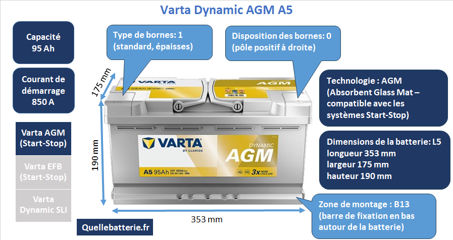 La série Varta Silver Dynamic AGM représente l’excellence du fabricant allemand Varta dans le domaine des batteries automobiles. Destinée aux véhicules modernes et hautement équipés, cette gamme utilise la technologie AGM (Absorbent Glass Mat), une solution avancée qui offre une endurance bien supérieure aux batteries plomb-acide traditionnelles. Grâce à cette technologie, l’électrolyte est absorbé par un séparateur en fibre de verre, garantissant ainsi une étanchéité parfaite, une sécurité accrue et une résistance élevée aux vibrations. Les batteries AGM supportent un nombre bien plus important de cycles de charge et de décharge, ce qui les rend idéales pour les véhicules dotés de systèmes start-stop avancés, mais aussi pour ceux équipés de nombreux consommateurs électriques, comme les systèmes multimédias, les sièges chauffants ou les systèmes de climatisation sophistiqués. Avec Silver Dynamic AGM, Varta offre une solution premium, reconnue pour sa fiabilité et largement utilisée comme équipement d’origine par de nombreux constructeurs automobiles. Le Varta Silver Dynamic AGM A5 est un exemple parfait de cette technologie de pointe. Avec une capacité de 95 Ah et un courant de démarrage de 850 A, il offre une puissance considérable, capable d’assurer un démarrage rapide et fiable, même par des températures très basses. Ce modèle est particulièrement adapté aux berlines et SUV haut de gamme, qui exigent une réserve d’énergie importante pour alimenter à la fois le système de démarrage et l’ensemble des équipements embarqués. Grâce à ses dimensions de 353 x 175 x 190 mm, le Varta A5 correspond au format européen standard L5, l’un des plus répandus dans les véhicules plus puissants et les modèles premium. Contrairement aux formats asiatiques, généralement plus hauts et plus étroits, l’A5 respecte les normes européennes classiques, ce qui garantit une intégration facile dans une large variété de modèles. Un aspect pratique du Varta A5 réside dans son système de montage B13, c’est-à-dire une bride inférieure qui entoure la base de la batterie et qui est la plus utilisée dans le standard européen. Cette fixation assure une stabilité optimale dans le compartiment moteur, même en cas de fortes vibrations. Les bornes sont de type 1, c’est-à-dire les bornes européennes classiques, ce qui permet un remplacement simple et direct sans adaptateur. L’association du format L5, des bornes standards et de la fixation B13 fait du Varta A5 une batterie parfaitement adaptée à de nombreux véhicules européens de grande taille. L’utilisation de la technologie AGM confère également au Varta A5 une grande résistance aux sollicitations énergétiques modernes. Dans les environnements urbains, où le moteur est amené à s’arrêter et redémarrer fréquemment à cause du système start-stop, une batterie classique se dégraderait rapidement. Le Varta A5, en revanche, est conçu pour supporter ces cycles répétés tout en continuant à alimenter les systèmes électroniques embarqués, comme la direction assistée électrique, les systèmes d’aide à la conduite et les dispositifs de sécurité. Cela garantit non seulement une durée de vie plus longue, mais aussi une fiabilité constante, même dans des conditions exigeantes. Si l’on compare le Varta A5 à ses concurrents directs, on retrouve par exemple le Bosch S5 AGM S5A 13. Celui-ci présente des caractéristiques identiques : 95 Ah de capacité, 850 A de courant de démarrage, dimensions de 353 x 175 x 190 mm, bornes de type 1 et fixation B13. En pratique, les deux modèles sont interchangeables et s’adressent au même segment de véhicules. La différence réside principalement dans la préférence de marque et la disponibilité locale. Bosch bénéficie d’une excellente réputation, mais Varta est souvent privilégié pour son partenariat direct avec de nombreux constructeurs automobiles européens. Au sein même de la gamme Varta, on trouve le Silver Dynamic AGM G14, qui affiche lui aussi exactement les mêmes spécifications techniques. Cette cohérence dans la gamme montre la volonté de Varta de proposer plusieurs références compatibles, afin de répondre aux différentes demandes du marché tout en garantissant le même niveau de performance. Le choix entre A5 et G14 dépendra donc surtout des références de montage recommandées par le constructeur du véhicule. Enfin, il convient de mentionner le Yuasa YBX9019, un concurrent japonais de la même catégorie. Lui aussi est un AGM de 95 Ah avec un courant de démarrage de 850 A et des dimensions identiques (353 x 175 x 190 mm). La principale différence se trouve dans la fixation, de type B3. Toutefois, les fixations B3 et B4 sont compatibles avec le standard B13, ce qui rend ce modèle également interchangeable avec le Varta A5 dans la majorité des cas. Yuasa, très implantée sur le marché asiatique, gagne en notoriété en Europe, mais Varta conserve un avantage en termes de diffusion et de notoriété auprès des constructeurs européens. En résumé, le Varta Silver Dynamic AGM A5 est une batterie haut de gamme conçue pour les véhicules modernes et puissants, nécessitant une réserve d’énergie élevée et une grande fiabilité. Son format L5, ses bornes standard de type 1 et sa fixation B13 en font un produit parfaitement adapté aux normes européennes. Grâce à la technologie AGM, elle offre une durée de vie prolongée, une meilleure résistance aux cycles répétés et une sécurité accrue. Face à ses concurrents directs comme le Bosch S5A 13, le Varta G14 ou le Yuasa YBX9019, elle se distingue par la solidité de la marque Varta et son adoption massive par les constructeurs automobiles. C’est un investissement sûr pour les conducteurs exigeants, soucieux de performance et de longévité.