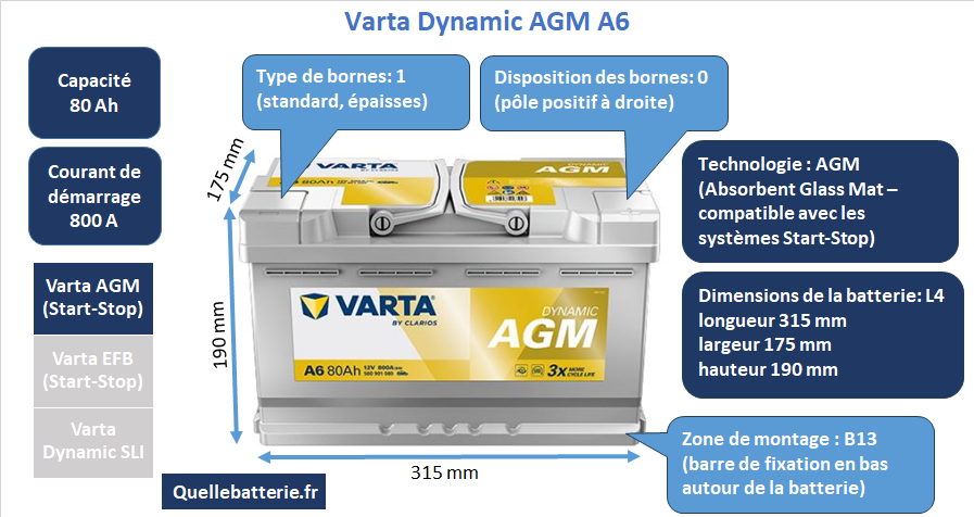 Le modèle Varta Silver Dynamic AGM A6 illustre parfaitement les qualités de cette série. Avec une capacité de 80 Ah et un courant de démarrage à froid de 800 A, cette batterie fournit l’énergie nécessaire même aux moteurs puissants ou aux véhicules équipés d’un grand nombre d’accessoires électriques, comme les sièges chauffants, les systèmes multimédias complexes ou les dispositifs de sécurité modernes. Ses dimensions de 315 x 175 x 190 mm correspondent au standard européen de taille L4, qui est l’un des formats les plus utilisés dans les voitures de classe moyenne et supérieure. Cette compatibilité dimensionnelle facilite son montage dans un grand nombre de véhicules, notamment les berlines et SUV européens récents. Le montage est de type B13, avec un agencement de bornes standard (pôle positif à droite, désigné par l’indice 0), ce qui garantit une installation aisée et sans adaptation supplémentaire dans la majorité des cas.