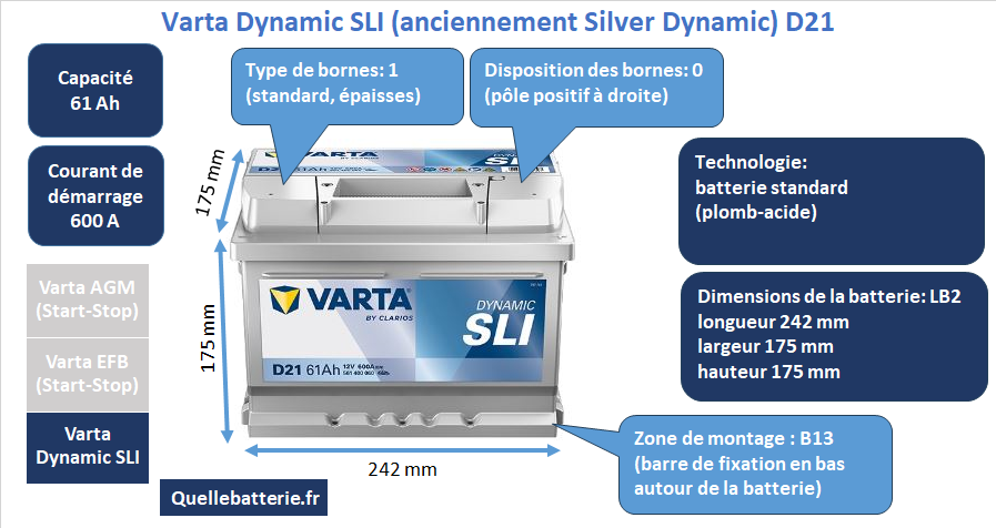 La gamme Varta Silver Dynamic se distingue comme l’une des plus performantes parmi les batteries plomb-acide conventionnelles disponibles sur le marché européen. Conçues pour offrir puissance, fiabilité et endurance, ces batteries visent les conducteurs dont les véhicules nécessitent une alimentation électrique stable et durable. Comparées aux gammes Blue Dynamic et Black Dynamic, elles se situent au sommet, avec une capacité de réserve plus importante et un courant de démarrage nettement supérieur. Cela les rend parfaitement adaptées aux voitures équipées de nombreux dispositifs électroniques de confort et de sécurité, comme la climatisation automatique, les systèmes multimédias avancés ou encore les aides à la conduite modernes. En revanche, il est important de souligner qu’il ne s’agit pas de modèles AGM ou EFB, et qu’elles ne conviennent donc pas aux véhicules dotés de la technologie start-stop. Le modèle Varta Silver Dynamic D21 illustre parfaitement ce savoir-faire. Avec une capacité de 61 Ah et un courant de démarrage de 600 A, cette batterie est conçue pour garantir un démarrage fiable même par temps froid, une situation où les batteries de qualité inférieure montrent souvent leurs limites. Ses dimensions exactes sont de 242 mm de longueur, 175 mm de largeur et seulement 175 mm de hauteur. Cette hauteur réduite constitue un atout majeur : la D21 est conçue pour les véhicules européens nécessitant un modèle bas, là où l’espace sous le capot est limité. Ses mesures correspondent au format H5/LB2, un standard européen reconnu, largement répandu dans de nombreux modèles de voitures compactes et familiales. Contrairement aux batteries asiatiques, qui affichent une hauteur supérieure à 190 mm et une largeur plus étroite, la D21 reste dans le standard européen, assurant ainsi une compatibilité optimale. L’implantation des pôles est de type 0, avec la borne positive placée à droite, une configuration classique pour la majorité des véhicules européens. Les bornes de type 1, standards sur le marché européen, facilitent le raccordement aux câbles d’origine. Enfin, le système de fixation B13 permet d’assurer une stabilité parfaite une fois installée, en limitant les vibrations et les mouvements qui peuvent réduire la durée de vie d’une batterie. L’ensemble de ces caractéristiques démontre que la D21 a été conçue pour offrir un remplacement simple et sûr dans une grande variété de modèles automobiles. Grâce à sa puissance de 600 A, la Varta D21 peut alimenter sans difficulté les moteurs essence et diesel de petite et moyenne cylindrée. Elle est particulièrement adaptée aux véhicules compacts, berlines familiales et certains SUV urbains qui requièrent une batterie fiable mais pas nécessairement de très grande capacité. Sa réserve de 61 Ah lui permet de supporter aisément les besoins énergétiques liés aux systèmes de confort modernes. De plus, la conception robuste et la faible autodécharge garantissent une durée de vie prolongée, même lorsque le véhicule n’est pas utilisé de manière régulière. Si l’on compare ce modèle avec d’autres batteries de la même catégorie, plusieurs points méritent d’être soulignés. Chez Bosch, la S30 04 ne propose que 53 Ah et 500 A, ce qui en fait un choix économique mais moins performant. La Bosch S40 04 monte à 60 Ah et 540 A, ce qui correspond davantage à un milieu de gamme. La Bosch S50 04, quant à elle, offre les mêmes spécifications que la Varta D21, soit 61 Ah et 600 A, ce qui en fait un concurrent direct. Ces équivalences montrent que Bosch et Varta se livrent une véritable compétition dans ce segment, chacune proposant une solution fiable adaptée à ce format précis. Au sein de la propre gamme Varta, la hiérarchie est également claire. Le modèle Black Dynamic C11, avec 53 Ah et 500 A, s’adresse aux véhicules moins exigeants. La Blue Dynamic D59, plus équilibrée, propose 60 Ah et 540 A, convenant à des voitures de taille moyenne. Enfin, la Silver Dynamic D21 occupe la position la plus élevée dans ce segment, offrant la capacité maximale et le courant de démarrage le plus élevé pour ces dimensions. Ainsi, un conducteur peut facilement choisir entre ces trois gammes selon ses priorités : prix, équilibre ou performance maximale. Les batteries Yuasa constituent une alternative intéressante. La YBX3065 de la série YBX3000 propose 56 Ah et 500 A, une solution adaptée aux voitures compactes mais inférieure à la D21. La YBX3075 monte à 60 Ah et 550 A, ce qui la rapproche déjà des valeurs offertes par Varta et Bosch. Enfin, la YBX5075 de la série YBX5000 affiche 60 Ah et 620 A, ce qui dépasse même la Varta D21 en termes de puissance de démarrage. Ces modèles utilisent un système de fixation B3/B4, totalement compatible avec le standard B13, ce qui les rend interchangeables avec les batteries Bosch et Varta. Ce choix supplémentaire permet aux automobilistes d’opter pour la marque qu’ils jugent la plus fiable ou la plus accessible. En conclusion, la Varta Silver Dynamic D21 est une batterie au format H5/LB2 qui combine puissance, fiabilité et design optimisé pour les véhicules européens. Avec 61 Ah de capacité et 600 A de courant de démarrage, elle représente une solution haut de gamme parfaitement adaptée aux voitures compactes et familiales modernes. Comparée à ses équivalents Bosch et Yuasa, elle occupe une place de choix grâce à son excellent rapport entre performances, compatibilité et robustesse. Pour tout automobiliste souhaitant une alimentation électrique stable et durable, la D21 constitue un investissement sûr et judicieux.