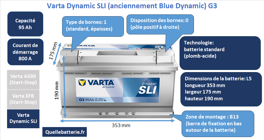 Le modèle Varta Blue Dynamic G3 est une batterie robuste et polyvalente, destinée aux véhicules nécessitant une alimentation fiable et durable. Avec une capacité de 95 Ah et un courant de démarrage de 800 A, elle offre une puissance optimale pour démarrer le moteur rapidement, même dans des conditions climatiques difficiles. Ses dimensions de 353 mm de longueur, 175 mm de largeur et 190 mm de hauteur la classent dans la catégorie L5, qui correspond à un standard européen couramment utilisé pour les véhicules de grande taille et certains utilitaires. Son système de fixation B13 assure une installation facile et sécurisée, compatible avec de nombreux modèles automobiles.