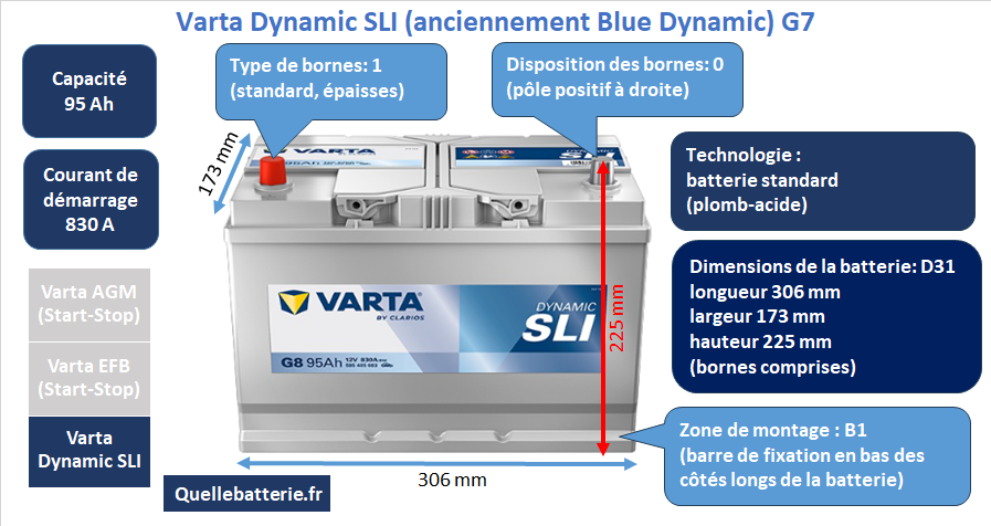 Côté alternatives proches, la Bosch S4 S40 28 est pratiquement une jumelle technique de la Varta G7 : même technologie plomb-acide, 95 Ah, 830 A, mêmes dimensions 306 x 173 x 225 mm, même polarité 0, mêmes bornes 1 et surtout le même montage B01. En pratique, le choix entre les deux se joue souvent sur la disponibilité, la date de fabrication, la garantie et le prix. Si vous cherchez une compatibilité “sans surprise” avec un bac B01, ces deux références sont les plus directes.