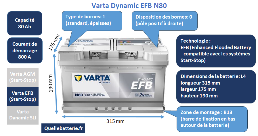 Le modèle Varta N80 de cette série est un exemple parfait de performance et de fiabilité. Il s'agit d'une batterie EFB dotée d'une capacité de 80 Ah et d'un courant de démarrage à froid impressionnant de 800 A. Ce courant élevé garantit une mise en marche efficace du moteur, même dans des conditions climatiques difficiles. Le boîtier mesure 315 mm de longueur, 175 mm de largeur et 190 mm de hauteur, ce qui correspond au format standard L4, très courant pour les véhicules de taille moyenne à grande du marché européen. Il s'agit donc d’un format typique pour de nombreuses berlines, breaks et SUV.