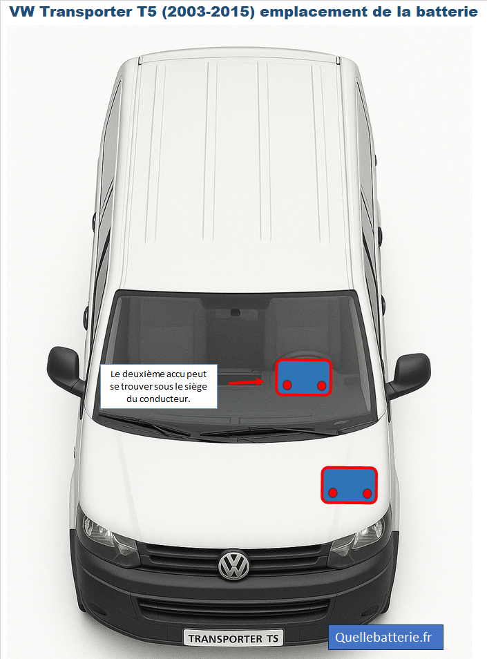 Si vous n'êtes toujours pas sûr de la batterie qui convient à votre VW Transporter, ou si vous souhaitez aider d'autres utilisateurs dans leur choix, veuillez nous envoyer une photo de votre batterie actuelle dans la section des commentaires en bas de la page. Vous pouvez également envoyer la photo à redaction@quellebatterie.fr (nous la placerons dans les commentaires pour aider également d'autres utilisateurs). Assurez-vous de spécifier le modèle de la voiture, l'année, le type, ainsi que la capacité et la puissance du moteur. Nous ferons de notre mieux pour vous assister !