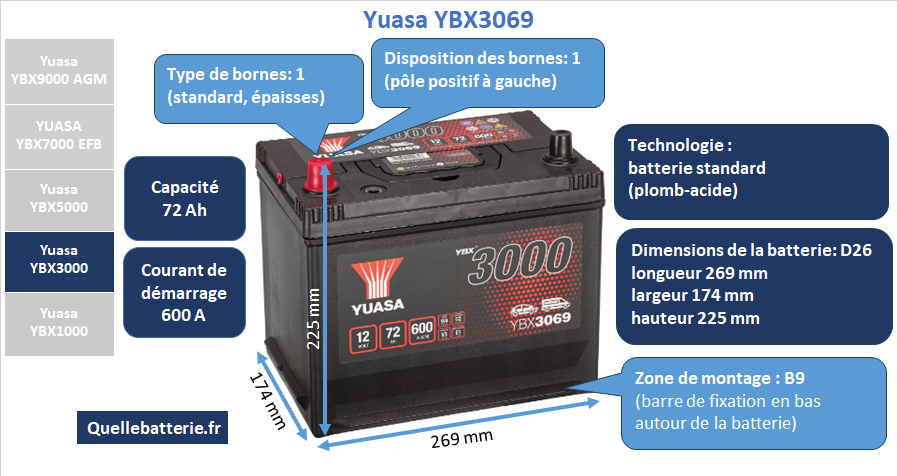 Le système de montage B9 du YBX3069 mérite également une attention particulière. Contrairement aux montages plus courants comme le B13 (présent sur la majorité des véhicules européens) ou le B1 (avec des rebords sur les côtés longs), le B9 est moins répandu. Cela signifie que la batterie possède un système de fixation différent, conçu pour des supports spécifiques. Il est donc essentiel de vérifier la compatibilité du bac à batterie avant l’installation. Yuasa précise toutefois que certains de ses modèles utilisant un montage B3/B4 sont compatibles avec les supports B13, ce qui montre une certaine flexibilité dans l’adaptation de ses produits. Dans le cas du B9, cette compatibilité n’est pas garantie, mais des adaptateurs peuvent parfois être utilisés.