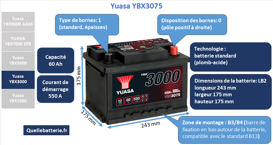 La série Yuasa YBX3000 représente une solution classique, robuste et éprouvée pour les conducteurs à la recherche d’une batterie au plomb-acide conventionnelle sans entretien. Conçue pour les véhicules standards non équipés du système Start-Stop, cette gamme allie technologie fiable, qualité de fabrication japonaise et compatibilité étendue avec une large palette de modèles automobiles. Les batteries YBX3000 offrent une excellente capacité de démarrage à froid, une bonne stabilité électrique, et sont spécialement élaborées pour répondre aux exigences des conditions climatiques européennes. Parmi les atouts de cette série, on note l’intégration de composants de haute qualité permettant une faible autodécharge, un boîtier solide pour résister aux vibrations, ainsi qu’un design interne optimisé pour maximiser la surface active des plaques. Les batteries YBX3000 conviennent parfaitement aux voitures à essence et diesel classiques, et garantissent un démarrage fiable tout au long de l’année. Yuasa YBX3075 – Une batterie compacte et puissante Le modèle Yuasa YBX3075 est l’un des représentants les plus équilibrés de cette gamme. Avec une capacité nominale de 60 Ah et un courant de démarrage à froid de 550 A, il convient parfaitement aux véhicules de taille moyenne à grande qui nécessitent un bon compromis entre performance et compacité. Ses dimensions de 243 x 175 x 175 mm lui permettent d’offrir une puissance intéressante tout en étant suffisamment compact pour s’adapter à de nombreux compartiments moteur européens. La hauteur réduite de 175 mm est un élément essentiel à souligner : ce modèle est conçu pour des véhicules nécessitant une batterie plus basse que le standard habituel de 190 mm. Il s’agit donc d’une batterie au format H5/LB2, typique pour de nombreuses voitures européennes, en particulier les modèles dont le capot moteur offre un espace vertical limité. C’est un avantage significatif par rapport aux batteries asiatiques, souvent plus hautes et parfois incompatibles avec ces véhicules. Un autre point distinctif du YBX3075 est sa zone de fixation inférieure au format B3/B4, moins courante que le très répandu B13. Toutefois, il est important de noter que ce système B3/B4 est entièrement compatible avec les supports B13 présents sur la majorité des voitures européennes. Cette compatibilité garantit une installation simple sans adaptateur supplémentaire, tout en offrant une meilleure stabilité de fixation grâce à la conception renforcée du socle. Comparaison avec d'autres modèles populaires Lorsque l’on compare le YBX3075 avec des modèles concurrents, plusieurs éléments se dégagent. Par exemple, le Bosch S3 004 et la Varta Black Dynamic C11 offrent une capacité légèrement inférieure de 53 Ah pour un courant de démarrage de 500 A. Ces modèles sont plutôt adaptés aux petites voitures ou à une utilisation moins exigeante en termes d’équipement électrique. Les batteries Bosch S4 004 et Varta Blue Dynamic D59 atteignent le même niveau de capacité que le YBX3075 (60 Ah) mais avec un courant de démarrage un peu plus bas (540 A). Cela les place dans la même catégorie de performance, bien que la Yuasa prenne un léger avantage avec ses 550 A, surtout lors des démarrages hivernaux. Pour les utilisateurs à la recherche de puissance maximale dans ce format, le Bosch S5 004 et la Varta Silver Dynamic D21 proposent une intensité de démarrage de 600 A, mais souvent à un prix plus élevé. Cependant, ils ne surpassent pas toujours la qualité de fabrication ni la durabilité des modèles Yuasa, très appréciés pour leur constance et leur robustesse. La Yuasa YBX3075 se distingue également de sa sœur, la YBX3065 (56 Ah, 500 A), par une capacité et une puissance supérieures tout en conservant exactement les mêmes dimensions. Pour ceux qui ont besoin d’encore plus de puissance sans changer de format, le modèle YBX5075 de la série YBX5000 (60 Ah, 620 A) est une alternative premium, avec des performances optimisées grâce à une technologie interne plus avancée. Conclusion Le Yuasa YBX3075 est une excellente solution pour les conducteurs européens à la recherche d’une batterie performante, fiable et compatible avec les fixations et dimensions de nombreux véhicules courants. Sa puissance de démarrage élevée, son format compact H5/LB2 et son socle B3/B4 compatible avec B13 en font une option parfaitement adaptée aux exigences modernes. Grâce à la rigueur technologique de Yuasa, ce modèle représente un investissement sûr pour plusieurs années de tranquillité au volant, en toutes saisons.