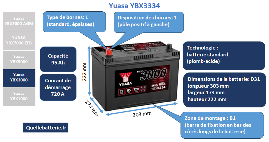 La série Yuasa YBX3000 regroupe des batteries au plomb-acide classiques, spécialement conçues pour répondre aux besoins des véhicules conventionnels ne disposant pas de technologie start-stop. Cette gamme offre un excellent compromis entre performance, fiabilité et coût, ce qui en fait l’un des choix privilégiés des automobilistes recherchant une solution robuste et durable. Les batteries YBX3000 se distinguent par leur conception soignée, qui réduit l’évaporation d’acide et limite les risques de fuites, tout en garantissant un démarrage fiable dans des conditions climatiques difficiles. Yuasa, marque japonaise de renommée internationale, s’appuie sur plusieurs décennies d’expérience dans le domaine des batteries pour proposer une gamme qui couvre aussi bien les petites citadines que les grandes berlines ou les SUV. Le modèle Yuasa YBX3334 illustre parfaitement cette approche. Avec une capacité de 95 Ah et un courant de démarrage de 720 A, il s’adresse à des véhicules de plus grande taille, notamment des berlines haut de gamme, des 4x4 et certains utilitaires qui nécessitent une réserve d’énergie importante pour alimenter à la fois le moteur et les nombreux systèmes électriques embarqués. Ses dimensions de 303 x 174 x 222 mm correspondent à un format très proche du standard D31 (305 x 173 x 225 mm). Ces proportions témoignent d’un format plus haut que les tailles européennes classiques de type L, ce qui rapproche ce modèle des standards asiatiques et nord-américains. Ces batteries sont en effet souvent plus hautes et conçues pour offrir une capacité supérieure, adaptée aux véhicules exigeants. L’un des points particuliers de la YBX3334 réside dans la disposition de ses bornes : la borne positive est située à gauche. Cette configuration, moins courante en Europe, impose une vigilance accrue au moment du choix, car une inversion de polarité rendrait le montage difficile, voire dangereux. C’est un élément essentiel à vérifier avant tout remplacement, surtout pour les automobilistes habitués aux batteries dont le pôle positif se situe traditionnellement à droite. Le type de fixation est un autre élément distinctif. La YBX3334 utilise un système B1, qui correspond à une semelle de montage située sur les côtés longs de la batterie. Cette configuration diffère du standard B13, qui prévoit une semelle entourant toute la base, et du B0, qui n’en possède pas. Le B1 est moins répandu, mais reste courant sur certains modèles de véhicules, notamment asiatiques. Il faut donc s’assurer que le bac de batterie du véhicule est compatible avec ce type de fixation. Contrairement aux versions B3 ou B4 des batteries Yuasa, compatibles avec le B13, le montage B1 reste spécifique et nécessite une adéquation stricte avec le support prévu dans le compartiment moteur. La puissance de 720 A au démarrage est légèrement inférieure à celle de certains modèles concurrents, mais elle reste largement suffisante pour la majorité des applications prévues. La comparaison avec la Bosch S4 S40 29 et la Varta Blue Dynamic G8 met en évidence cette différence : ces deux modèles affichent la même capacité de 95 Ah mais un courant de 830 A, pour des dimensions quasi identiques (306 x 173 x 225 mm). Dans la pratique, cette différence de 110 A peut jouer un rôle dans des conditions extrêmes, comme un démarrage par des températures très basses, mais pour un usage courant la YBX3334 fournit déjà une réserve de puissance solide et parfaitement adaptée. Il convient également de mentionner la Yuasa YBX5334, issue de la gamme YBX5000. Elle reprend les mêmes dimensions que la YBX3334 (303 x 174 x 222 mm) mais avec une puissance de 830 A. Cette variante illustre bien la stratégie de Yuasa, qui propose plusieurs niveaux de performance selon les besoins et le budget des clients. Les automobilistes recherchant une batterie endurante pour un usage intensif ou pour un véhicule fortement équipé en électronique embarquée pourraient privilégier la YBX5334, tandis que la YBX3334 constitue une alternative plus économique sans sacrifier la qualité de fabrication. Le choix d’une telle batterie doit tenir compte non seulement de la capacité et du courant de démarrage, mais aussi de la compatibilité dimensionnelle et mécanique. La hauteur de 222 mm confirme qu’il s’agit d’un format plus proche des standards internationaux que de ceux généralement rencontrés sur le marché européen. Cela en fait un produit un peu plus spécialisé, destiné à des véhicules particuliers, souvent importés ou conçus pour fonctionner avec des batteries plus hautes et plus puissantes. En conclusion, la Yuasa YBX3334 est une batterie robuste et fiable, pensée pour les voitures et utilitaires de forte cylindrée nécessitant une réserve d’énergie conséquente. Son format proche du D31, sa polarité gauche et son montage B1 en font un modèle spécifique qu’il faut sélectionner avec soin. Elle offre une puissance solide de 720 A, parfaitement adaptée à un usage courant, et se positionne comme une alternative de confiance face à des références établies comme Bosch et Varta, tout en proposant une option plus abordable que la YBX5334 de la même marque. Pour les automobilistes à la recherche d’un compromis entre prix, fiabilité et compatibilité, la YBX3334 représente un choix pertinent et sûr.