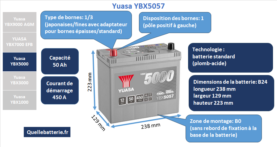 La série Yuasa YBX5000 représente la gamme haut de gamme de batteries au plomb-acide conventionnelles proposées par le fabricant japonais Yuasa. Conçues pour les véhicules ne disposant pas de technologie start-stop, ces batteries offrent une longévité accrue, une meilleure résistance aux cycles de charge et de décharge ainsi qu’une performance de démarrage supérieure par rapport aux modèles plus standards comme ceux de la série YBX3000. Yuasa a développé la YBX5000 pour répondre aux besoins des automobilistes qui souhaitent investir dans une batterie durable et robuste, capable de supporter un usage intensif et de résister aux conditions climatiques exigeantes. Ce positionnement en fait un choix privilégié pour les conducteurs recherchant à la fois fiabilité, puissance et sécurité. Le modèle Yuasa YBX5057 illustre parfaitement cette philosophie. Avec une capacité de 50 Ah et un courant de démarrage à froid de 450 A, il se place dans le segment des batteries destinées aux citadines et compactes, mais avec une marge de puissance supérieure à la moyenne de cette catégorie. Ce surcroît d’énergie permet d’assurer des démarrages sûrs, même par températures négatives, tout en alimentant les équipements électriques modernes des véhicules, tels que les systèmes multimédia, la climatisation ou l’électronique embarquée. Par rapport aux modèles de 45 Ah couramment utilisés, cette batterie offre un confort supplémentaire en termes de fiabilité. Ses dimensions de 238 x 129 x 223 mm correspondent au format B24, très répandu sur les véhicules asiatiques. Ce format se caractérise par une largeur réduite et une hauteur supérieure à celle des standards européens, confirmant son appartenance à la catégorie des batteries dites « asiatiques ». Ce type de batterie est couramment monté sur les voitures japonaises (Toyota, Honda, Nissan) et sur certains modèles coréens. Le choix d’une telle batterie doit donc être fait en tenant compte de la compatibilité dimensionnelle et mécanique du compartiment moteur. La YBX5057 dispose d’un agencement des bornes de type « 1 », c’est-à-dire avec la borne positive située à gauche lorsqu’on regarde la batterie de face. Cette polarité n’est pas universelle et doit absolument être vérifiée avant le remplacement, sous peine d’incompatibilité avec les câbles de la voiture. C’est un détail crucial, car même une batterie aux dimensions parfaites ne pourra pas être utilisée si la polarité ne correspond pas à celle prévue par le constructeur automobile. Un autre point important concerne le type de fixation. La YBX5057 est dotée d’un montage B0, ce qui signifie qu’elle ne possède pas de semelle inférieure. Contrairement au B13, très courant en Europe et qui entoure toute la base, ou au B1 qui concerne les côtés longs, le B0 impose un système de fixation différent, souvent par le haut ou sur les côtés de la batterie. Ce type de montage, moins répandu en Europe, est typique des véhicules asiatiques. Les automobilistes doivent donc s’assurer que leur bac de batterie est prévu pour recevoir ce format, afin de garantir un maintien optimal et sécuritaire. Le modèle se distingue également par son type de bornes « 1/3 », avec un adaptateur permettant de passer du format asiatique (type 3) au format européen (type 1). Cet élément ajoute de la polyvalence, car il permet à la batterie d’être installée aussi bien dans des véhicules initialement prévus pour les bornes japonaises que dans ceux utilisant les bornes européennes standard. C’est un avantage pratique, qui augmente les possibilités d’utilisation de la YBX5057. La comparaison avec des modèles concurrents met en lumière ses points forts. La Bosch S4 S40 23 et la Varta Blue Dynamic B34, toutes deux de 45 Ah et 330 A, présentent les mêmes dimensions extérieures, mais leur puissance de démarrage est nettement inférieure. En hiver ou pour des véhicules sollicitant davantage la batterie, cette différence peut être déterminante. Dans la gamme Yuasa elle-même, la YBX3057 de la série YBX3000 offre 45 Ah et 400 A, mais reste en retrait par rapport à la YBX5057, qui fournit 5 Ah et 50 A supplémentaires, ainsi qu’une meilleure endurance grâce à la technologie de la série YBX5000. En pratique, la YBX5057 constitue donc un choix premium pour les automobilistes possédant un véhicule compact d’origine japonaise ou coréenne. Elle garantit une puissance de démarrage plus élevée que la plupart de ses concurrentes directes et s’impose comme une solution fiable et durable, adaptée aux conditions réelles de circulation. Sa polarité gauche, son format asiatique B24, son montage B0 et ses bornes adaptables en font un modèle spécifique, mais parfaitement dimensionné pour les besoins de nombreux conducteurs. En conclusion, la Yuasa YBX5057 est une batterie compacte haut de gamme, offrant 50 Ah et 450 A dans un format B24 asiatique, avec polarité gauche et fixation B0. Elle surpasse ses concurrentes Bosch et Varta en puissance de démarrage, et constitue une évolution renforcée par rapport à la Yuasa YBX3057. Sa conception soignée, sa polyvalence grâce aux bornes adaptables et sa robustesse en font un choix de confiance pour tous ceux qui recherchent la performance et la durabilité dans une batterie automobile.